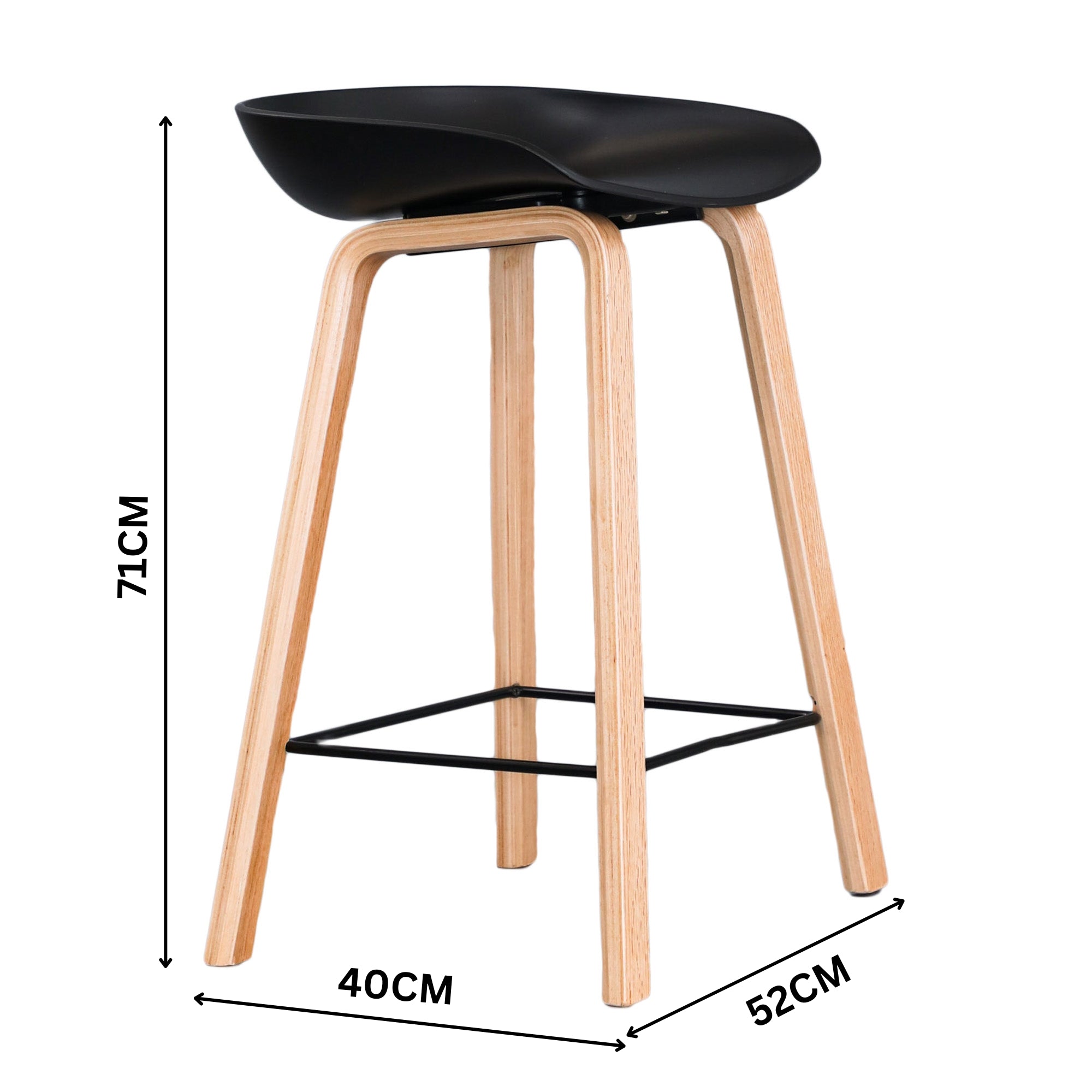 This bar stool in a Scandinavian style adds sheen to your workplace or home. It is a black furniture with natural colour legs. The bar stool has a solid frame that combines comfort and reliable support. Its structural frame is made of PP (Polypropylene) shell, metal and powder coated solid wood. Polypropylene is a highly durable yet lightweight material that can withstand heavy use and resist damage from scratches. This makes it ideal for use in bar stools that need to be tough, long-lasting, and easily movable. The furniture piece provides a smooth, supple surface and a comfy seat to relax in. It is a modern, versatile barstool with a tailored seat and a metal leg rest for comfortable seating support. Standing tall and strong on powder coated plywood legs, it provides comfortable seating. And thanks to its timeless shape, it can be paired with a table of any style. A one-year warranty is included with the frame of this fully assembled barstool. The bar stool has dimensions of W52 x D40 x H71.