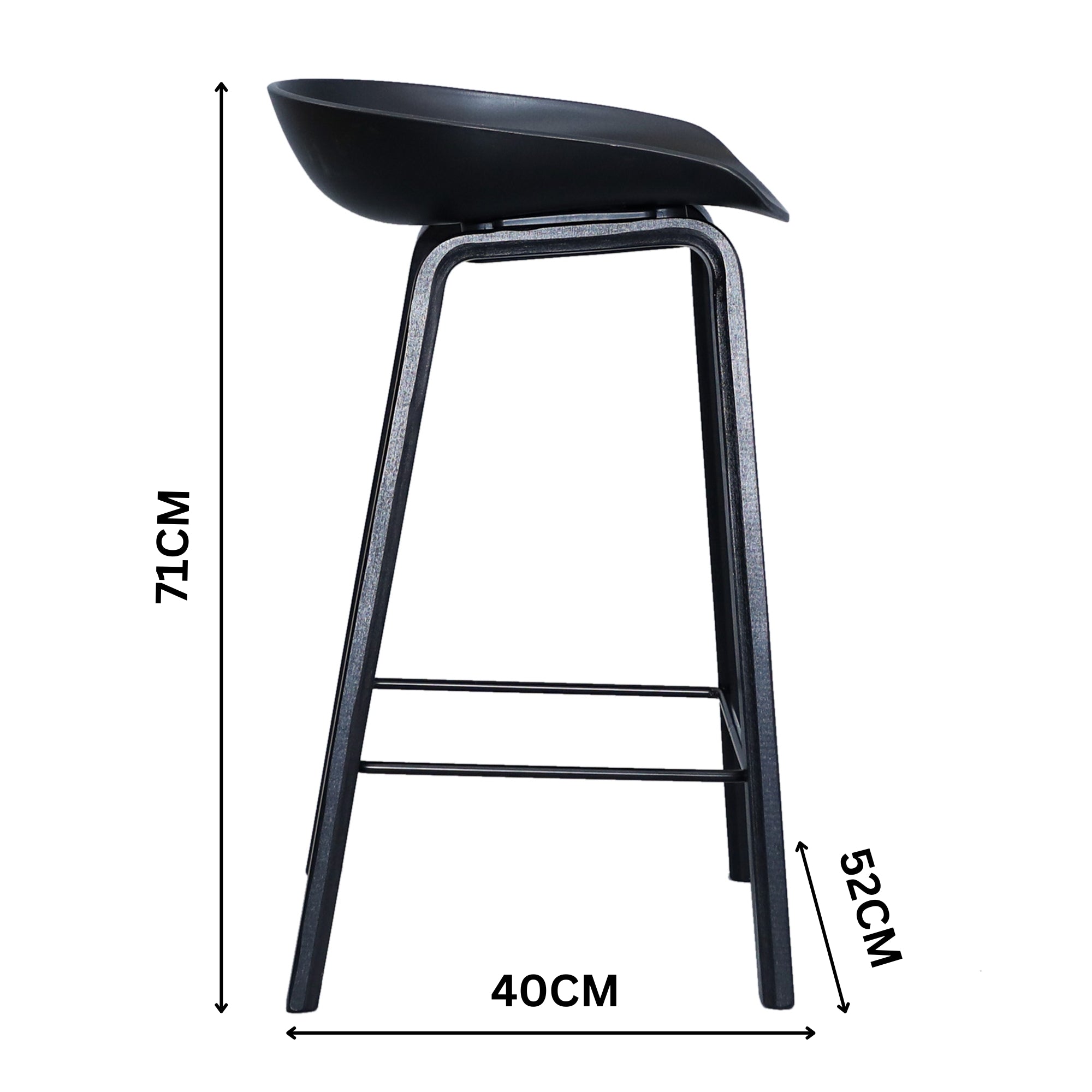 This bar stool in a Scandinavian style adds sheen to your workplace or home. It is a black furniture with black colour legs. The bar stool has a solid frame that combines comfort and reliable support. Its structural frame is made of PP (Polypropylene) shell, metal and powder coated solid wood. Polypropylene is a highly durable yet lightweight material that can withstand heavy use and resist damage from scratches. This makes it ideal for use in bar stools that need to be tough, long-lasting, and easily movable. The furniture piece provides a smooth, supple surface and a comfy seat to relax in. It is a modern, versatile barstool with a tailored seat and a metal leg rest for comfortable seating support. Standing tall and strong on powder coated plywood legs, it provides comfortable seating. And thanks to its timeless shape, it can be paired with a table of any style. A one-year warranty is included with the frame of this fully assembled barstool. The bar stool has dimensions of W52 x D40 x H71