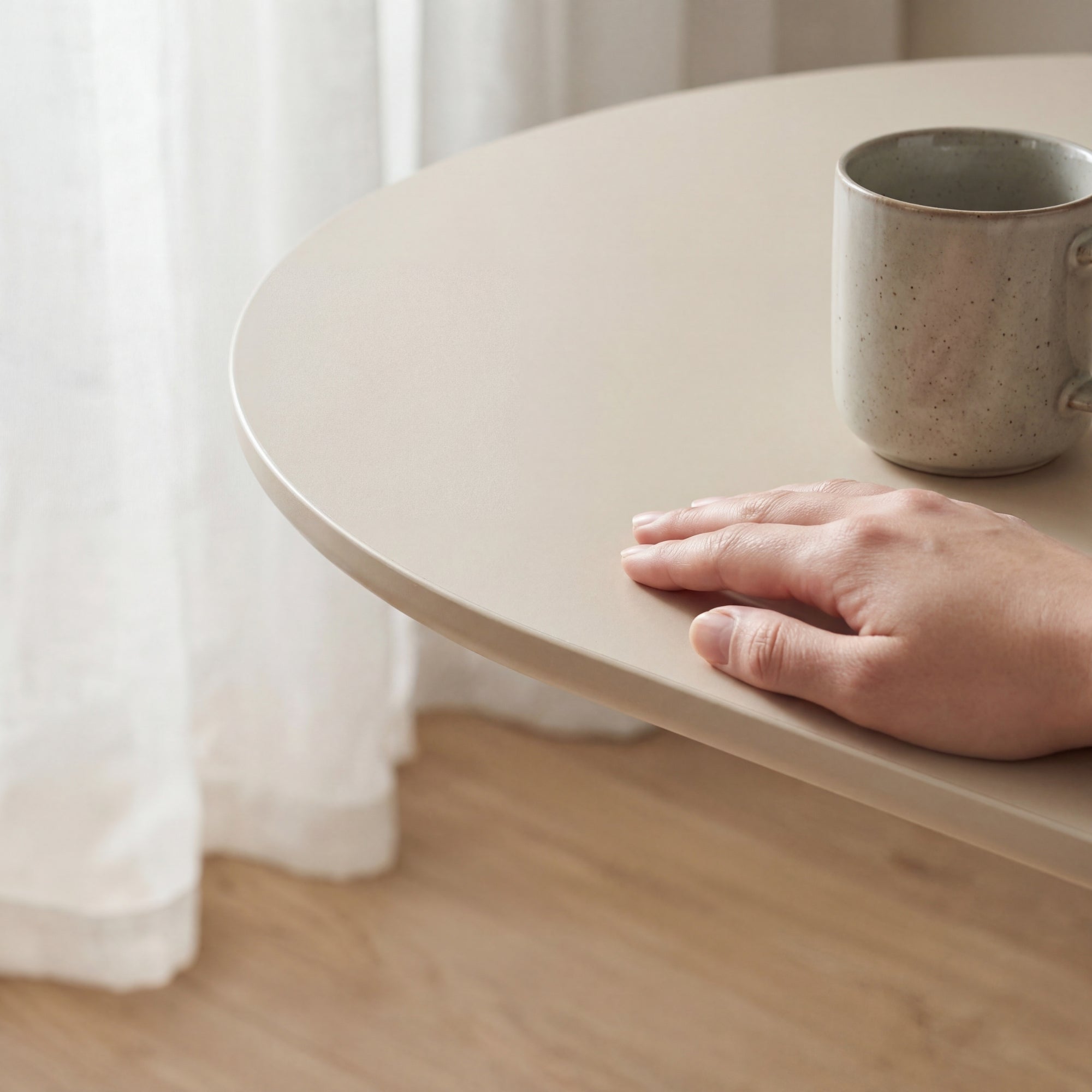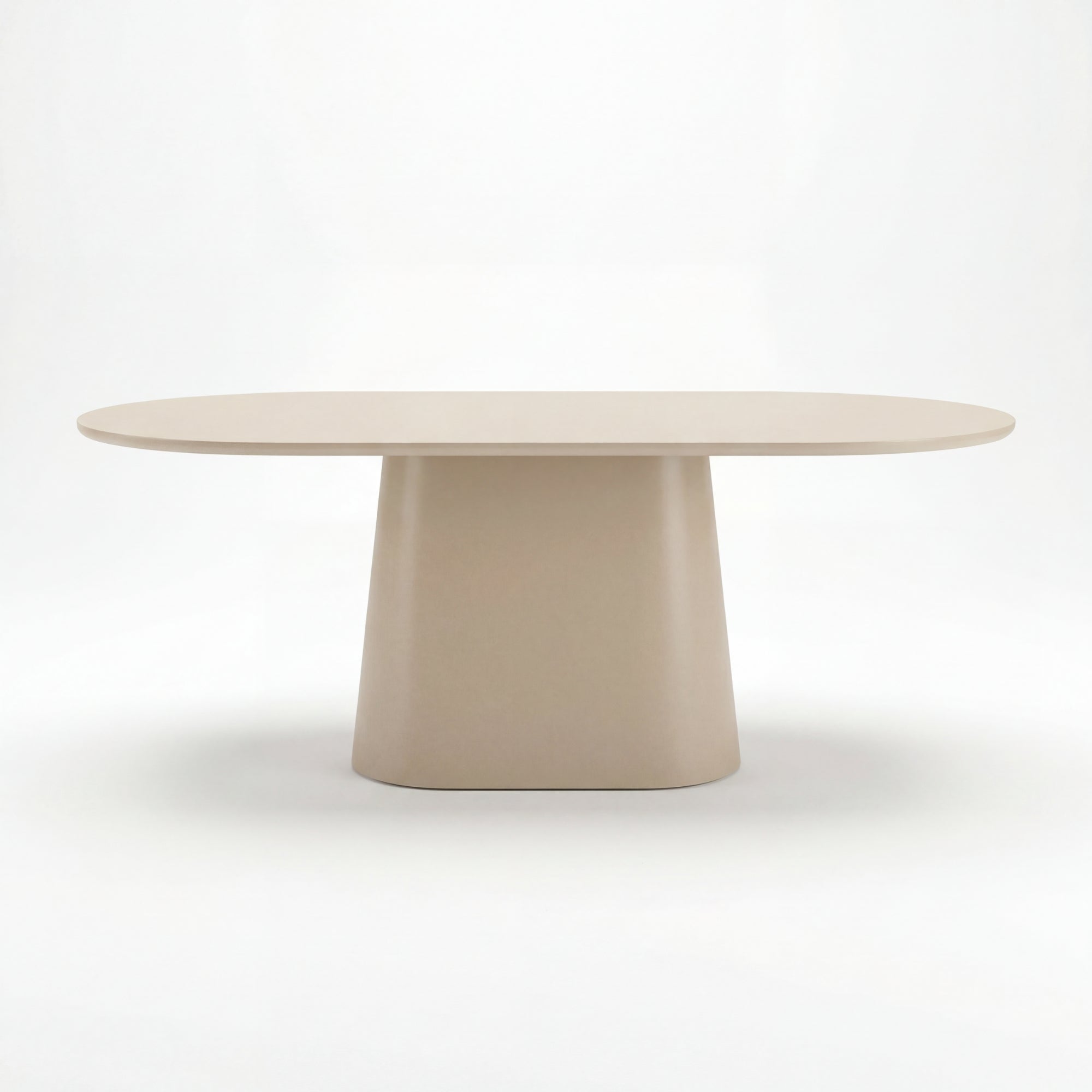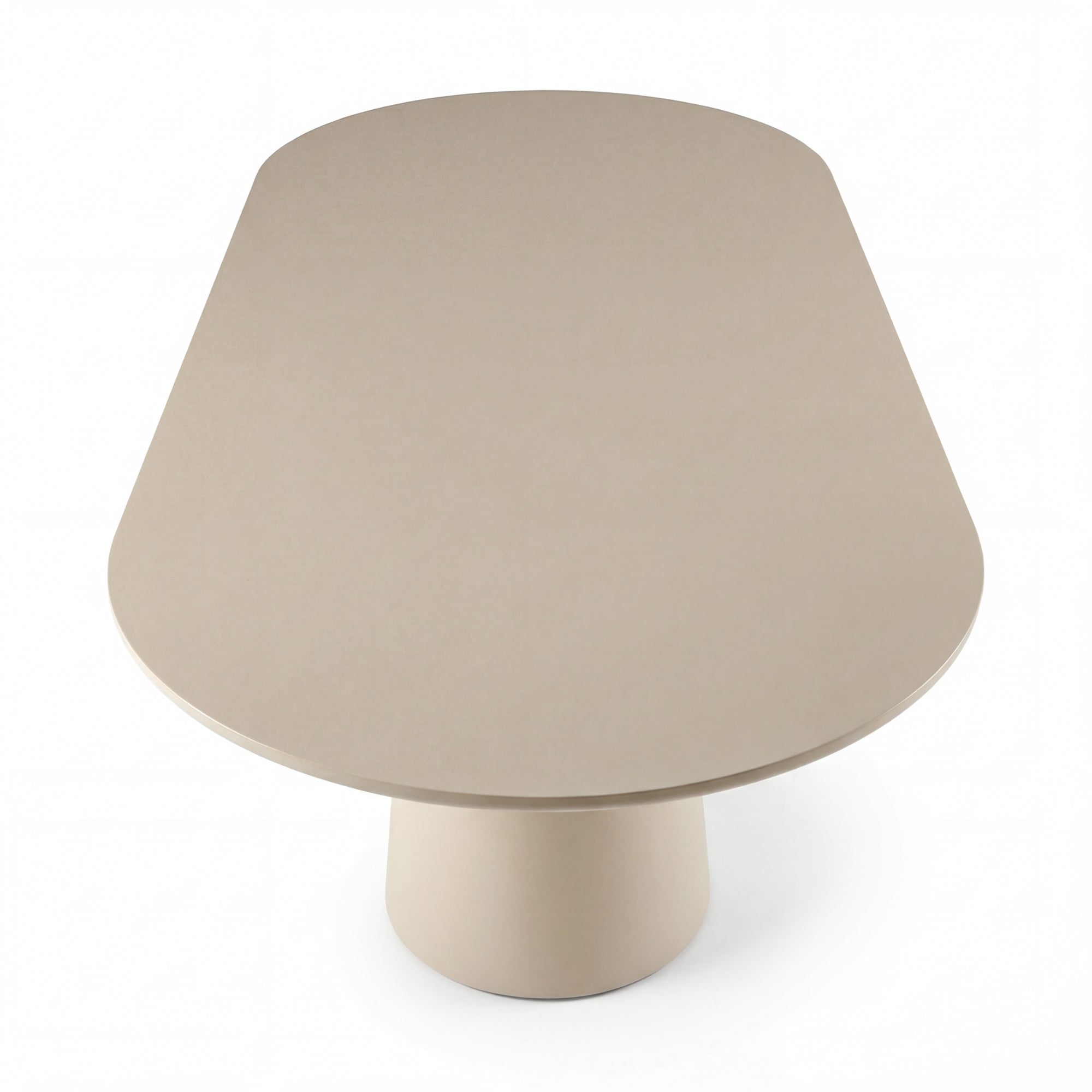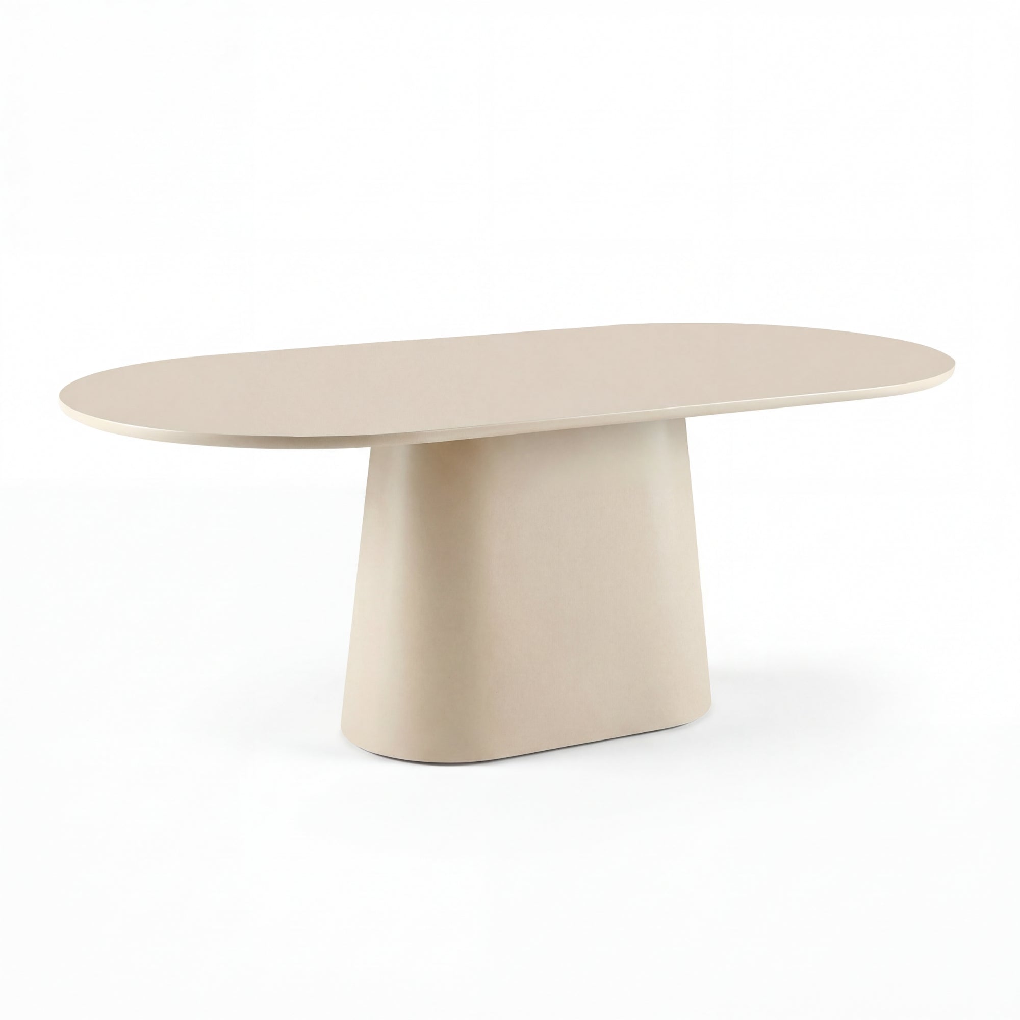 Bring effortless style and functionality to your dining space with this 200cm curved dining table in putty colour. Designed with a soft, contemporary aesthetic, this table features a smooth round silhouette and a calming neutral finish that complements a wide range of interiors - from modern and minimalist to coastal and Scandinavian. Crafted from durable MDF with a matte painted finish, the 25mm thick tabletop offers strength and everyday practicality, while the beveled edge detailing adds a refined, modern touch. The sturdy, fully assembled base ensures stability and support, making it perfect for daily dining and casual gatherings. Compact yet stylish, this dining table is ideal for apartments, smaller dining areas, or creating an intimate dining setting with a contemporary edge.