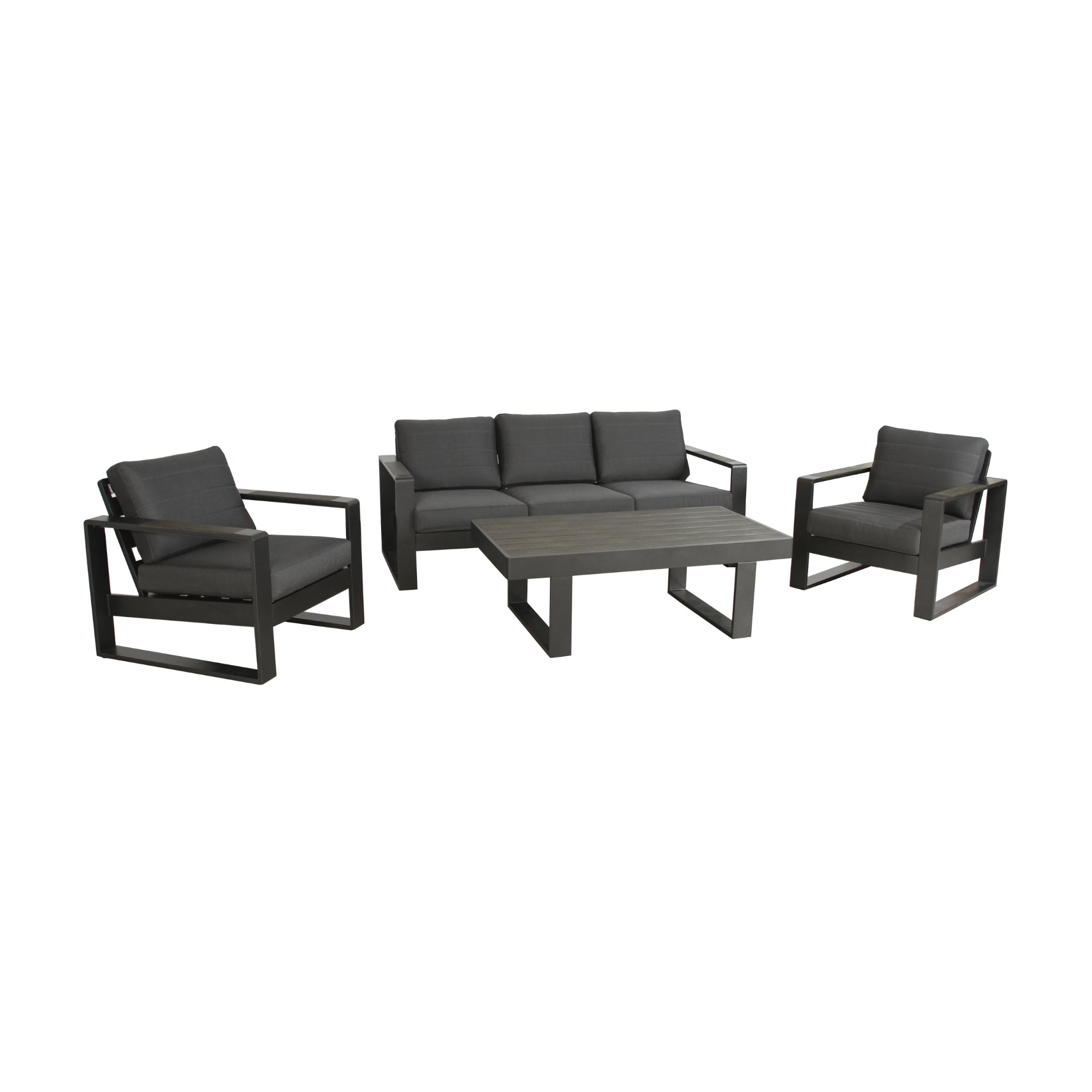 Introducing the Maderia 4Pc Lounge Set in an elegant charcoal color, designed to elevate your outdoor living space with style and comfort. This contemporary lounge set features a robust aluminum frame with a low-maintenance, non-rust powder coat finish, ensuring durability and long-lasting use. The set includes a spacious 3-seater sofa, two armchairs, and a coffee table with a polywood slatted tabletop and polywood arm inserts for a sophisticated look. The dark grey cushions, crafted from weatherproof, water-repellent, and UV-protected polyester fabric, offer both style and comfort. Easy to assemble and maintain, this lounge set is perfect for any outdoor setting.