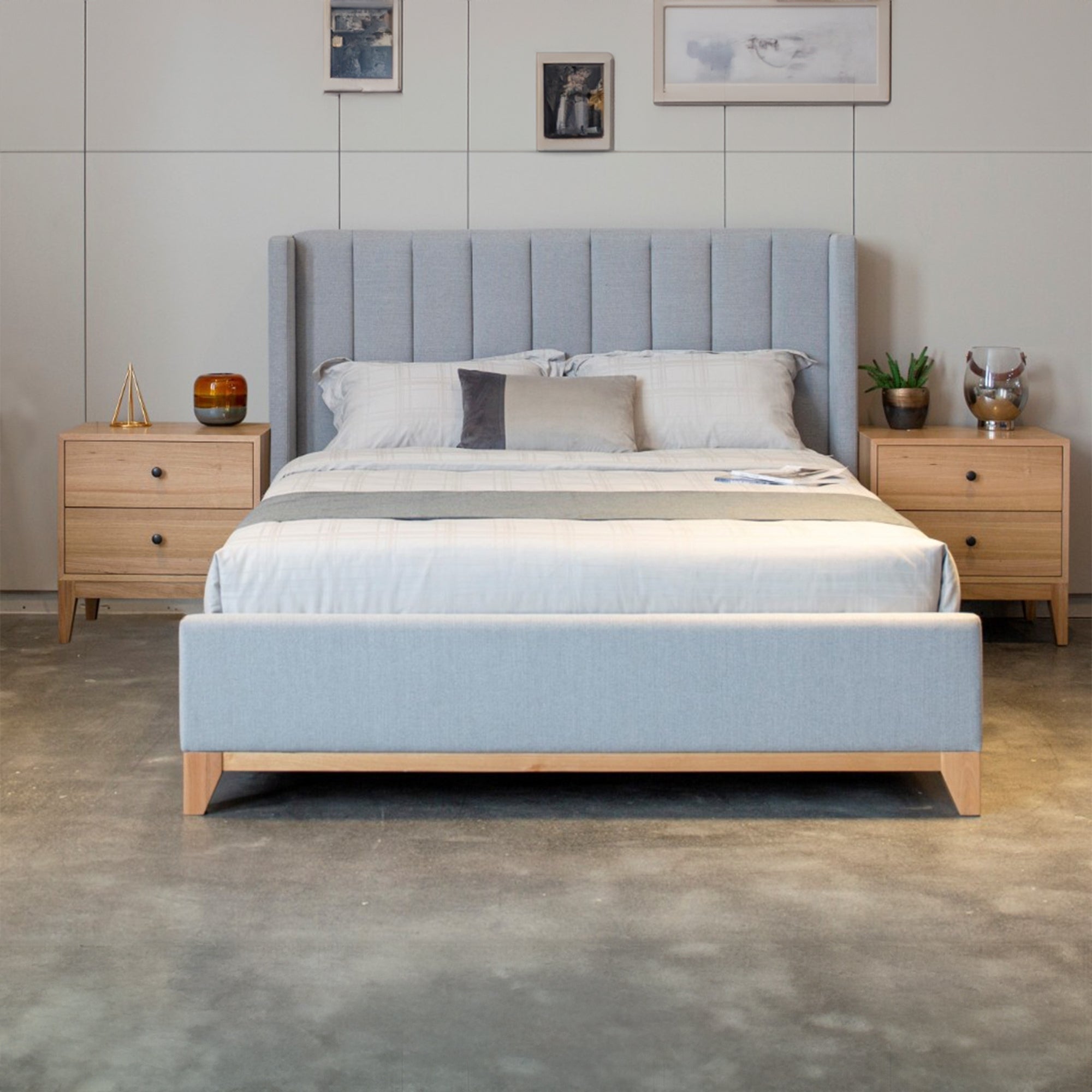 Upgrade your bedroom with this double size bed with vertical panel in light grey colour, a stylish and functional centerpiece designed for modern living. Upholstered in plush light grey fabric, the bed features a vertical channel winged headboard that adds a contemporary touch while providing comfortable back support for reading or lounging. Constructed with solid Messmate timber legs, strong slats, and a central support, this bed ensures long-lasting stability and comfort. The bed also incorporates wireless phone chargers and USB ports on both sides, offering convenient charging for all compatible devices without the clutter of cords. Its neutral light grey upholstery and natural timber legs allow seamless integration into a wide range of interior decor styles. Combining style, durability, and smart functionality, this double bed delivers a luxurious and practical sleeping experience.