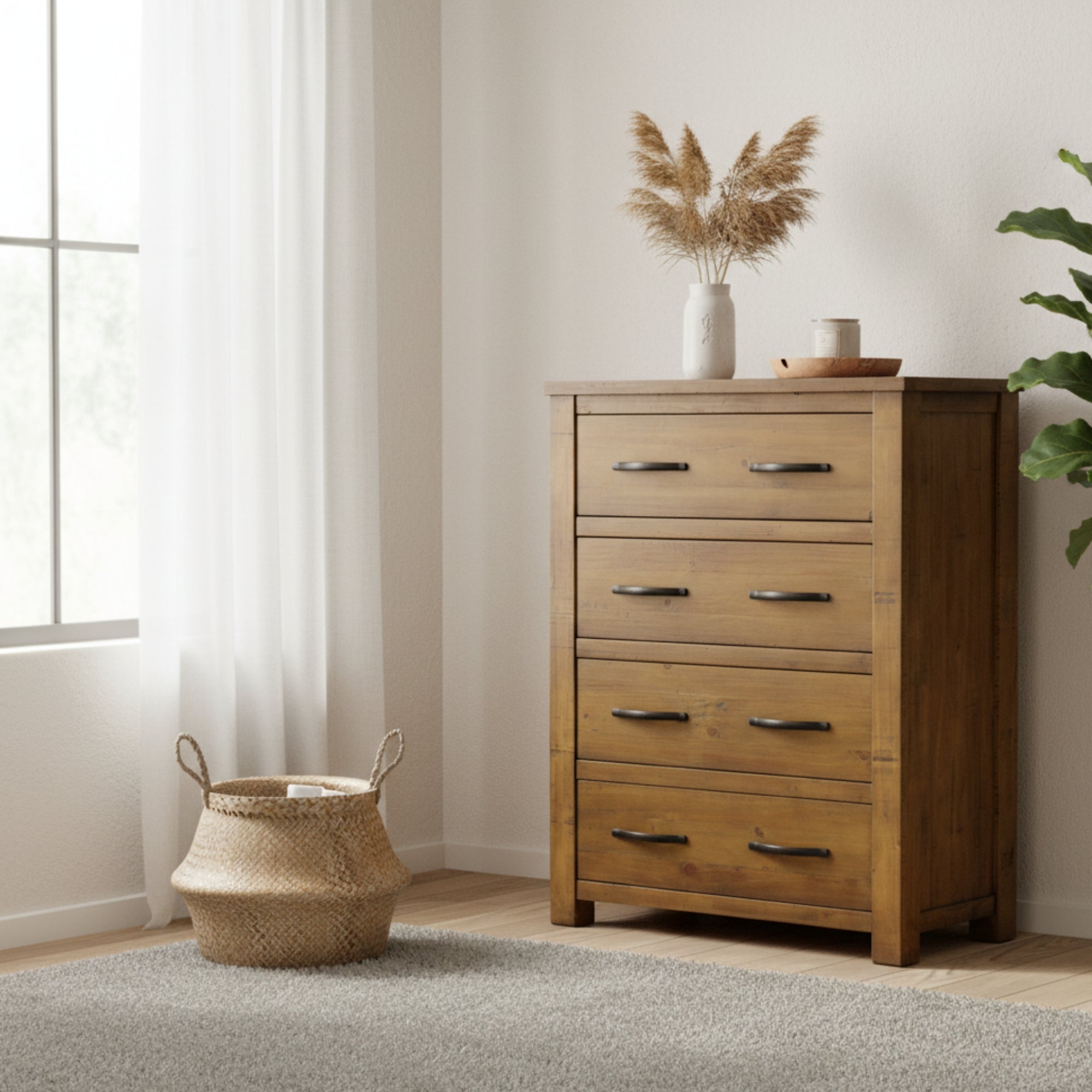 Add a touch of timeless charm to your bedroom with this 4-Drawer Tallboy. Crafted from solid pine in an aged sundried ash finish, its rustic aesthetic highlights natural knots and grains for a warm, traditional look. Designed for durability, it features sturdy construction and smooth-functioning drawers with full-extension metal runners and black metal handles, providing practical storage with effortless style.