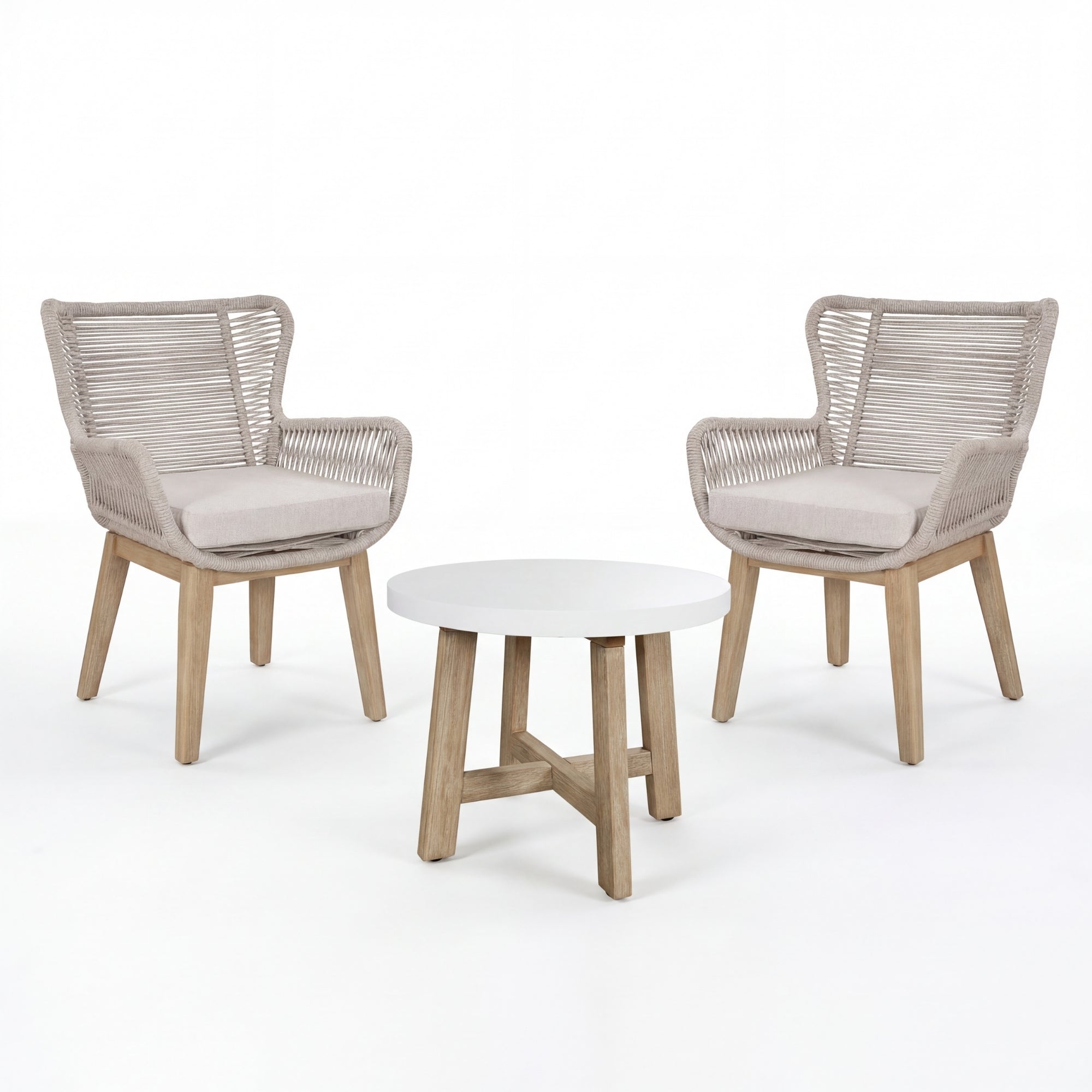 This good-looking 3-piece chat set facilitates the perfect leisure time in outdoor areas. Suitable for medium to large outdoor areas, the set, designed in contemporary style, consists of two armchairs, and one round side table. The structural frame of the set is made of solid Eucalyptus timber, rope, and polycement. The Solid eucalyptus timber leg frames provide great durability and strength. This timber is special also because it is extremely dense, rot- and decay-resistant, and has a high oil content that repels water and moisture. The dining chairs are beautifully upholstered in 100% polyester and the side table has polycement top that requires low maintenance. Water resistant rope is used in the chairs and weather-proof, water repellent, UV protected cushions are included in the set for extra comfort. With white rope, whitewash cushion fabric, and white polycement tabletop, the multi-colour set looks even more gorgeous. The set is durable as well. The frame comes with a two-year warranty, while the fabric, foam, and polycement come with a one-year warranty.