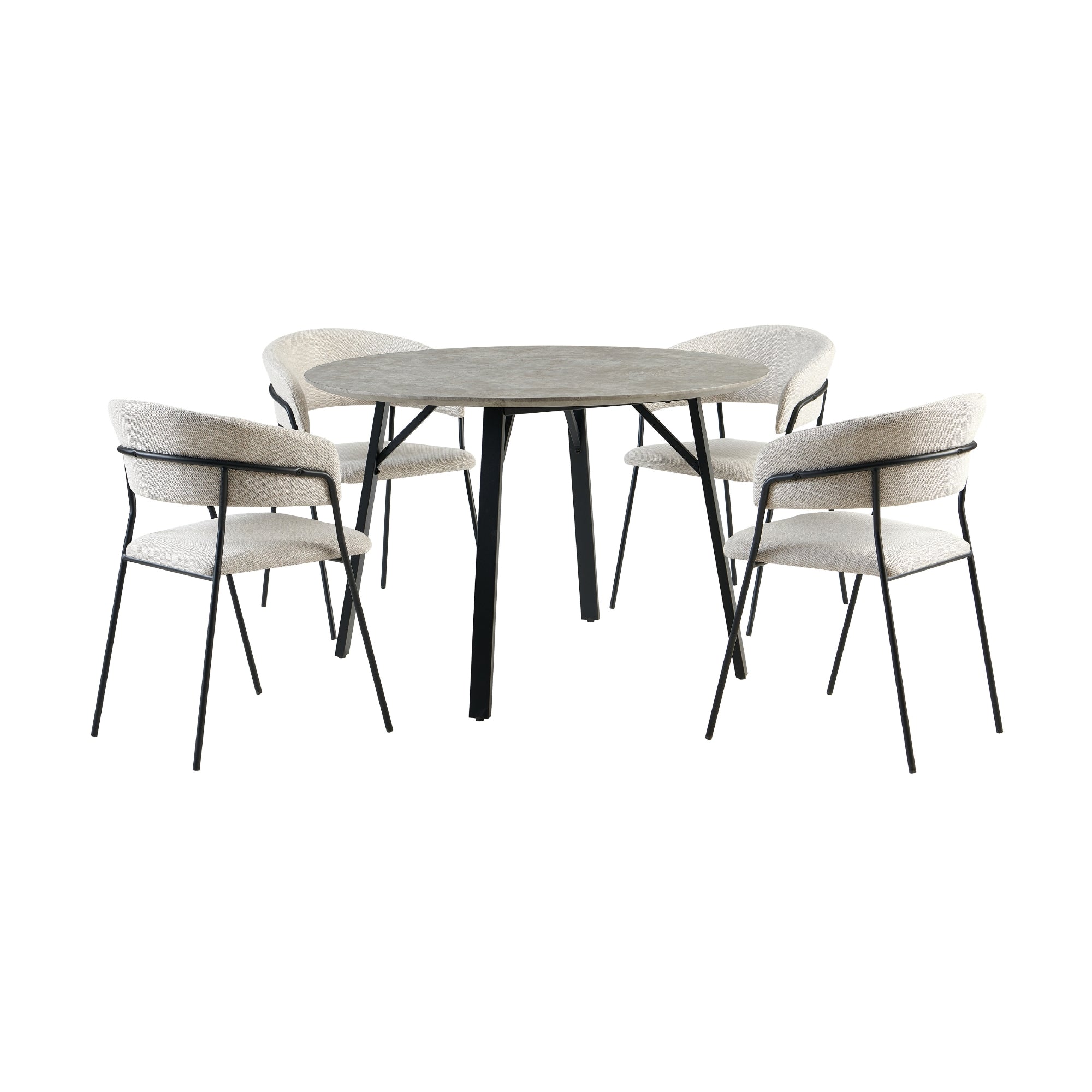Upgrade your dining space with this 5-Piece Round Dining Set, designed for modern elegance and everyday practicality. The grey stone-colored MDF tabletop with a realistic marble look is waterproof, heat-resistant, and scratch-resistant, making it easy to maintain. The sandy black powder-coated metal legs provide stability and a sleek contrast. The beige fabric-upholstered dining chairs feature a curved backrest and cushioned seat for ultimate comfort. Perfect for small to medium dining spaces, this stylish set blends seamlessly with various interiors.