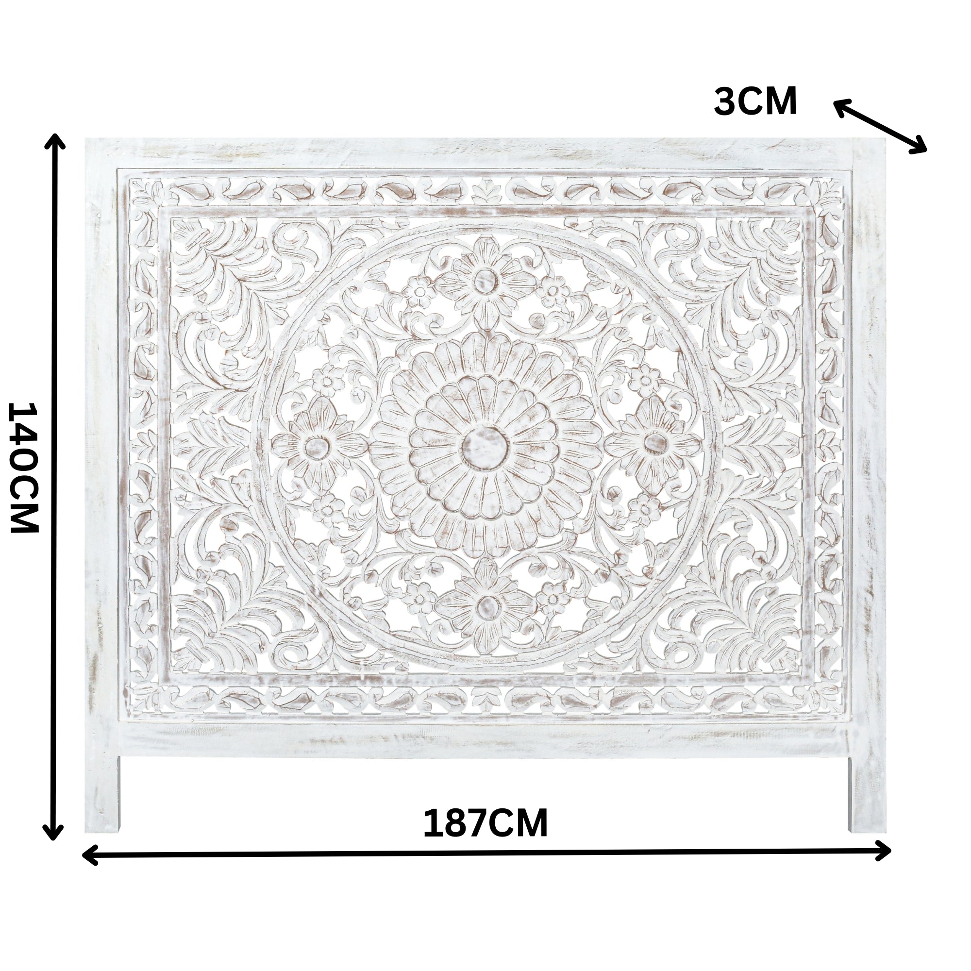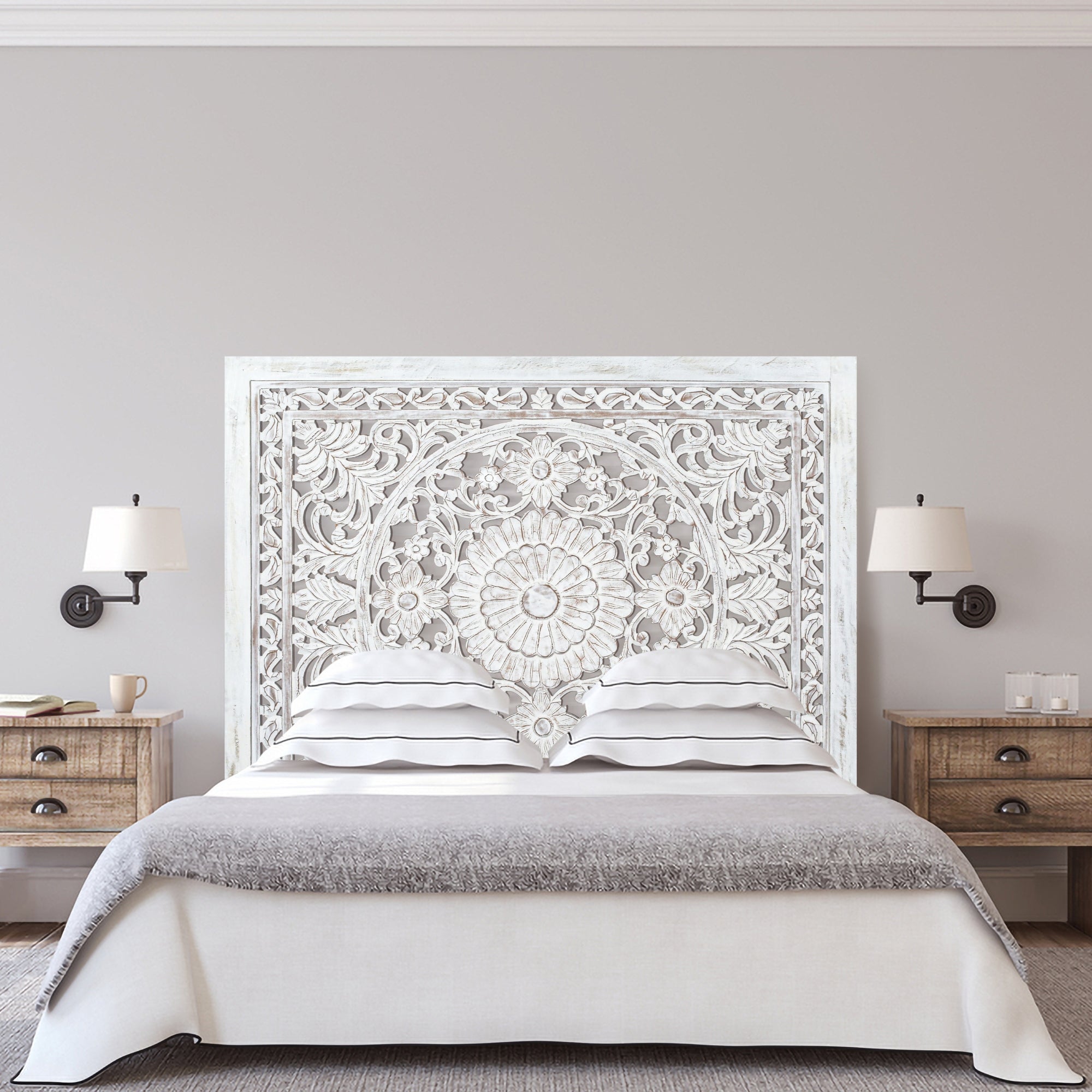 Bring timeless elegance to your bedroom with this King Headboard in Antique White. Beautifully handcrafted from a combination of solid Mango Wood and durable MDF, this tall statement piece showcases refined craftsmanship and classic charm. Its elegant design and antique white finish make it the perfect addition to both modern and traditional interiors. Designed for easy installation, the headboard includes two sturdy D-hooks at the back for secure wall mounting. Whether paired with a neutral palette or bold decor, this headboard instantly elevates your bedroom with its graceful appearance and premium construction.
