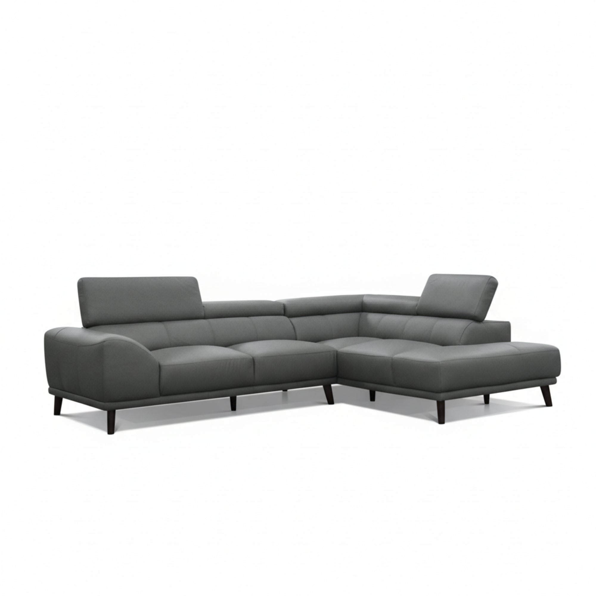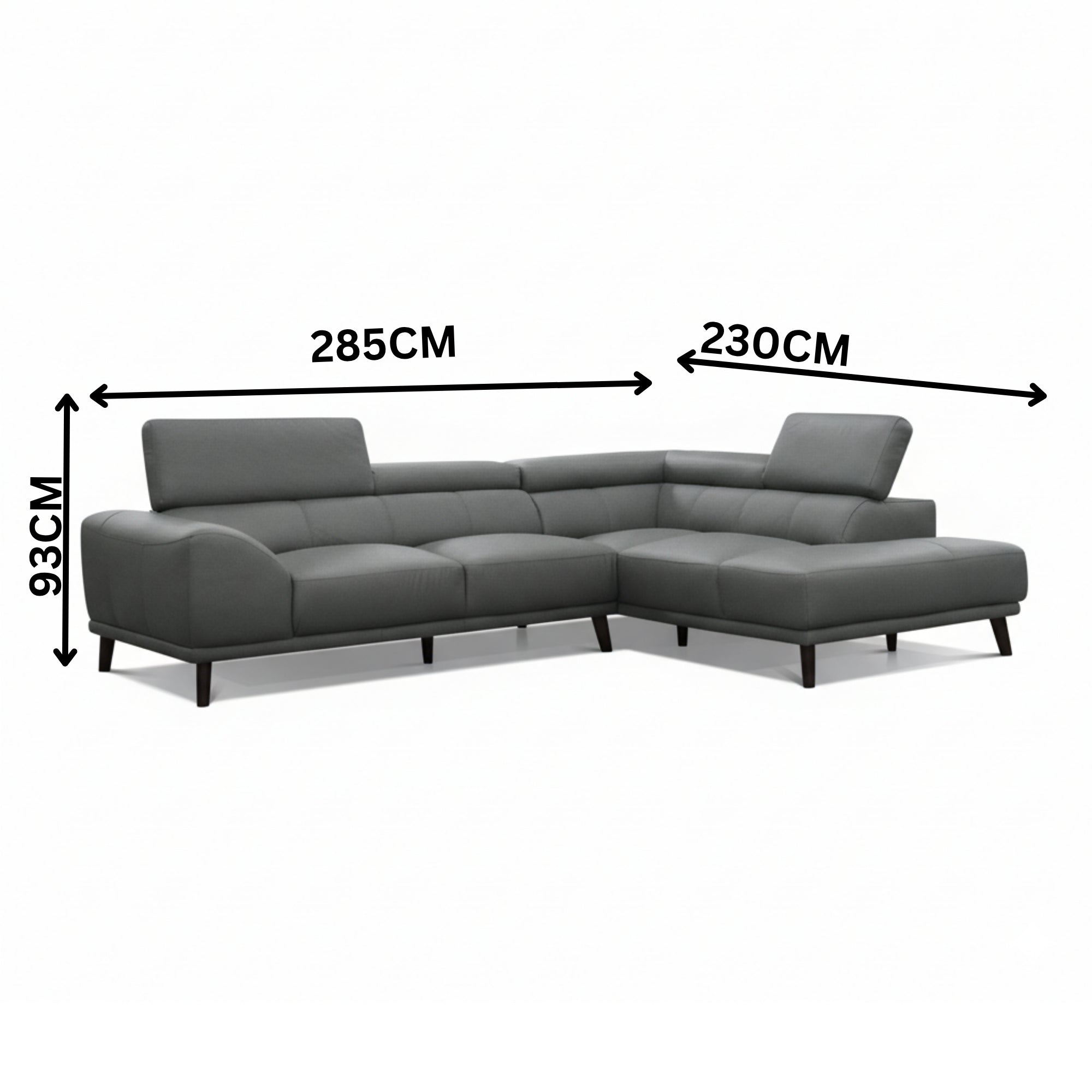 Experience luxurious comfort and contemporary style with this 2-Seater with RHF in Mid Grey colour. Designed with expansive seating and wide feature arms, this lounge piece offers ultimate relaxation for your living space. Upholstered in premium Bruno corrected leather, it exudes sophistication while providing durability and easy maintenance. The slim line plinth detail adds a modern aesthetic, and three manually adjustable headrests allow for personalized support and comfort. Crafted with a solid hardwood and plywood frame and supported by high-density foam, zig-zag springs, and webbing, this 2-seater delivers both long-lasting comfort and structural integrity. Solid acacia legs provide stability while completing the sleek design. Perfect for contemporary living rooms, this piece combines style, functionality, and premium comfort for a truly elevated lounge experience.