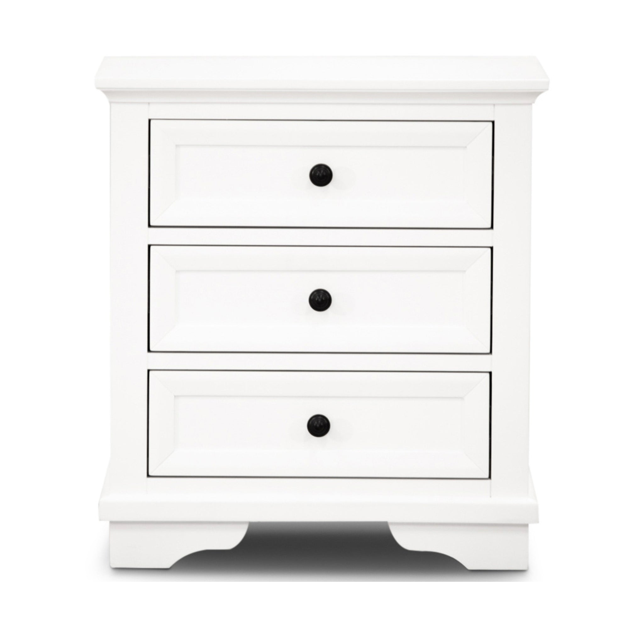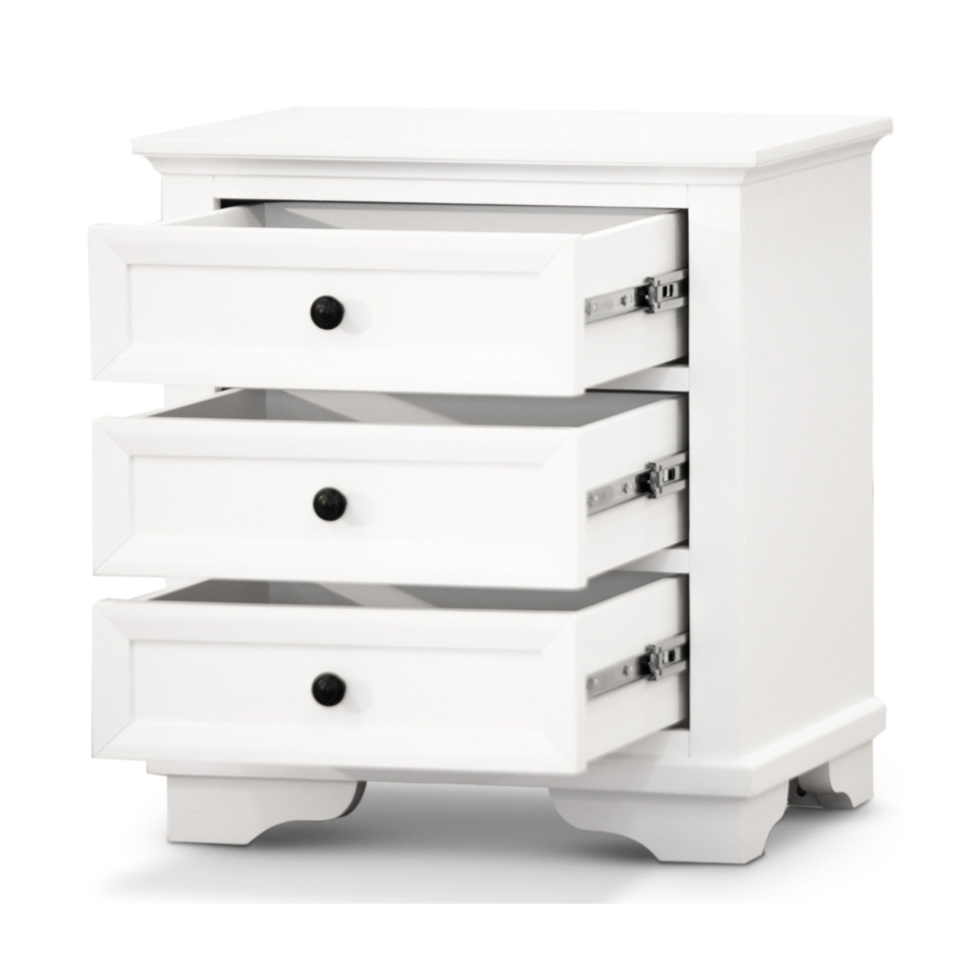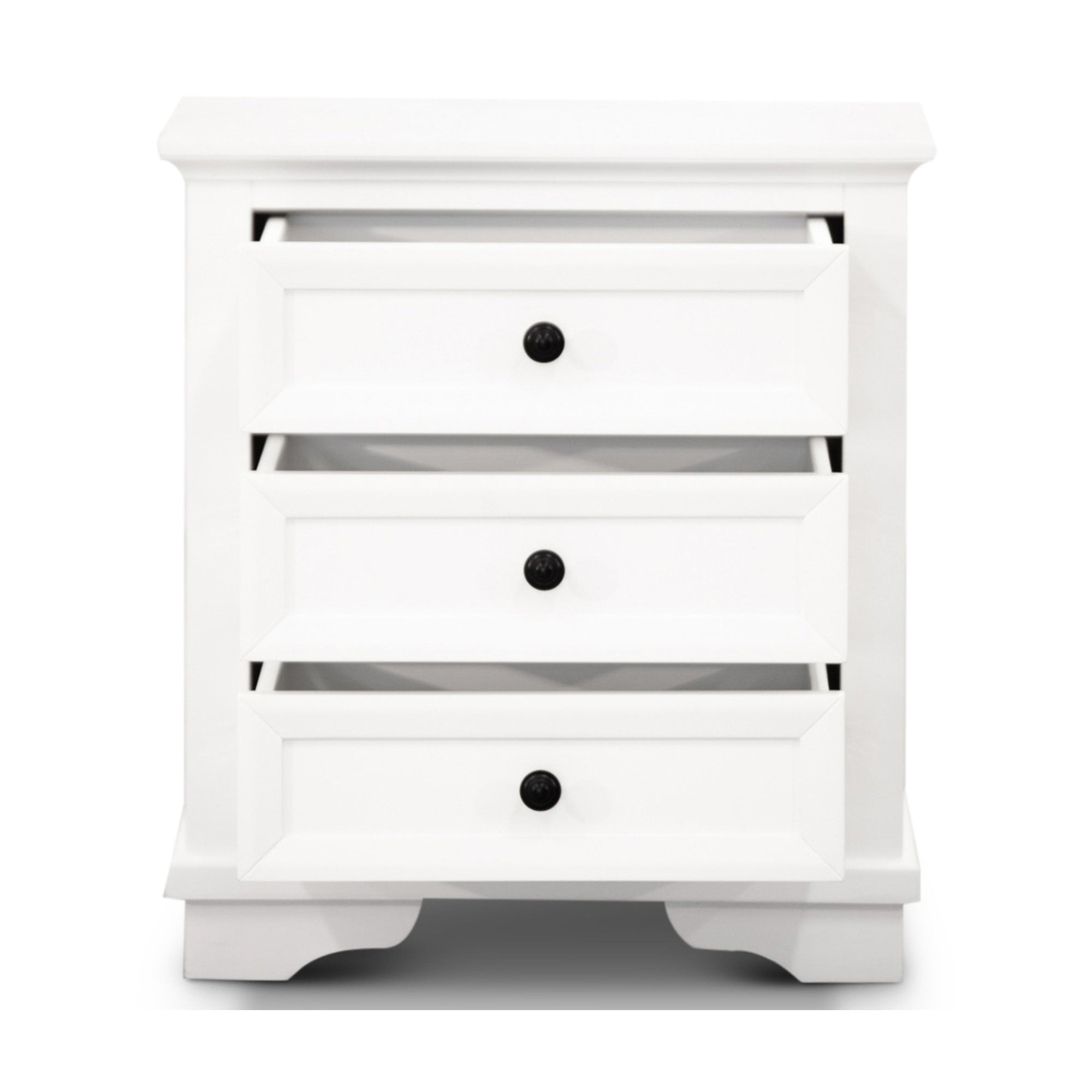 Bring timeless coastal charm and functional elegance to your bedroom with this 3-drawer bedside table in white painted finish. Designed to pair beautifully with contemporary or coastal-inspired interiors, this bedside table features a clean look complemented by matte black metal handles for a striking contrast. Crafted from sustainably sourced Acacia and MDF timber, it offers durability and refined craftsmanship. The three spacious drawers with solid bases and metal extension runners provide smooth access and practical storage for your nightly essentials - combining beauty, simplicity, and utility in one elegant piece.