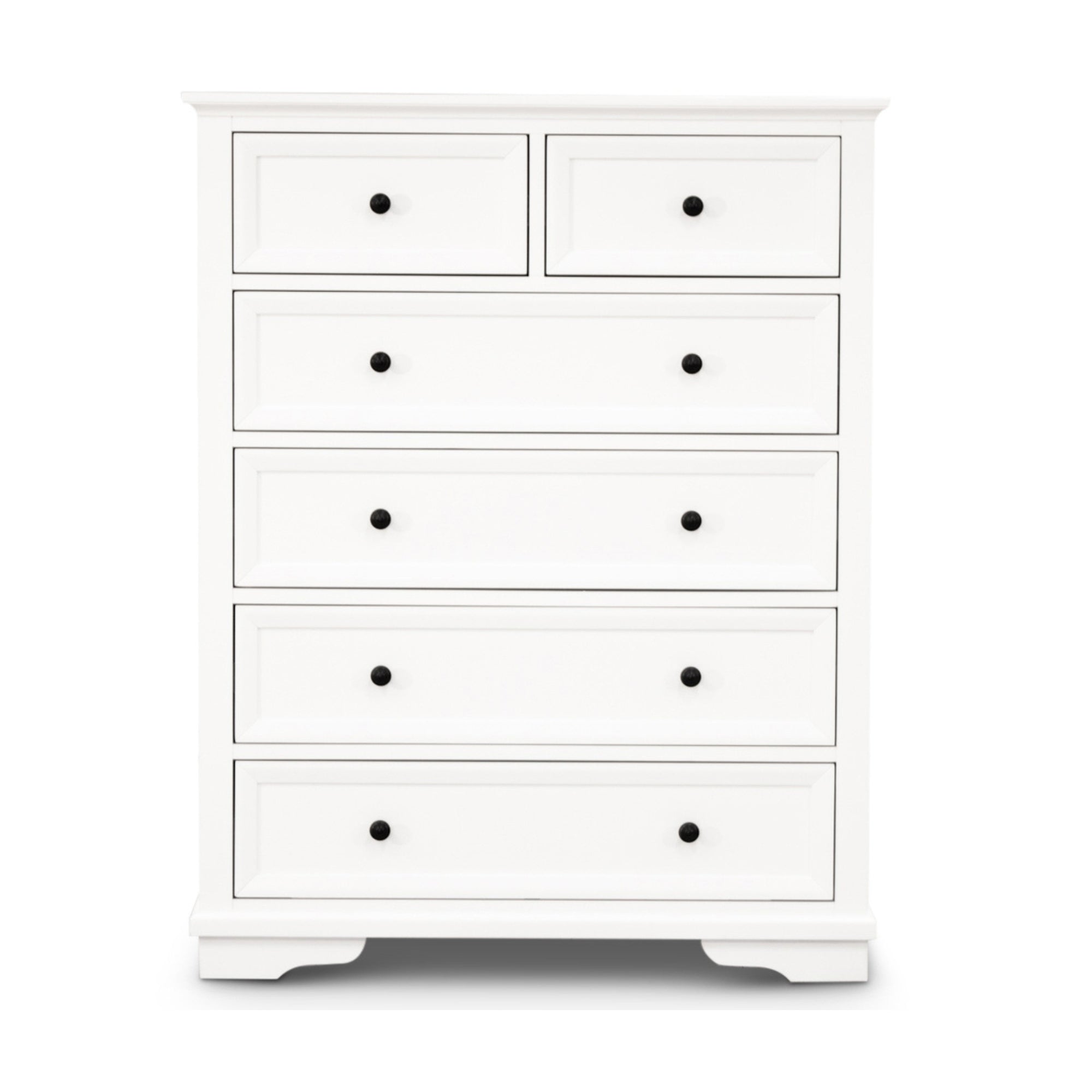 Bring timeless coastal charm and functional elegance to your bedroom with these 2 over 4-drawers tallboys in white painted finish. Designed to pair beautifully with contemporary or coastal-inspired interiors, this tallboy features a clean look complemented by matte black metal handles for a striking contrast. Crafted from sustainably sourced Acacia and MDF timber, it offers durability and refined craftsmanship. The four spacious drawers with solid bases and metal extension runners provide smooth access and practical storage for your nightly essentials - combining beauty, simplicity, and utility in one elegant piece.